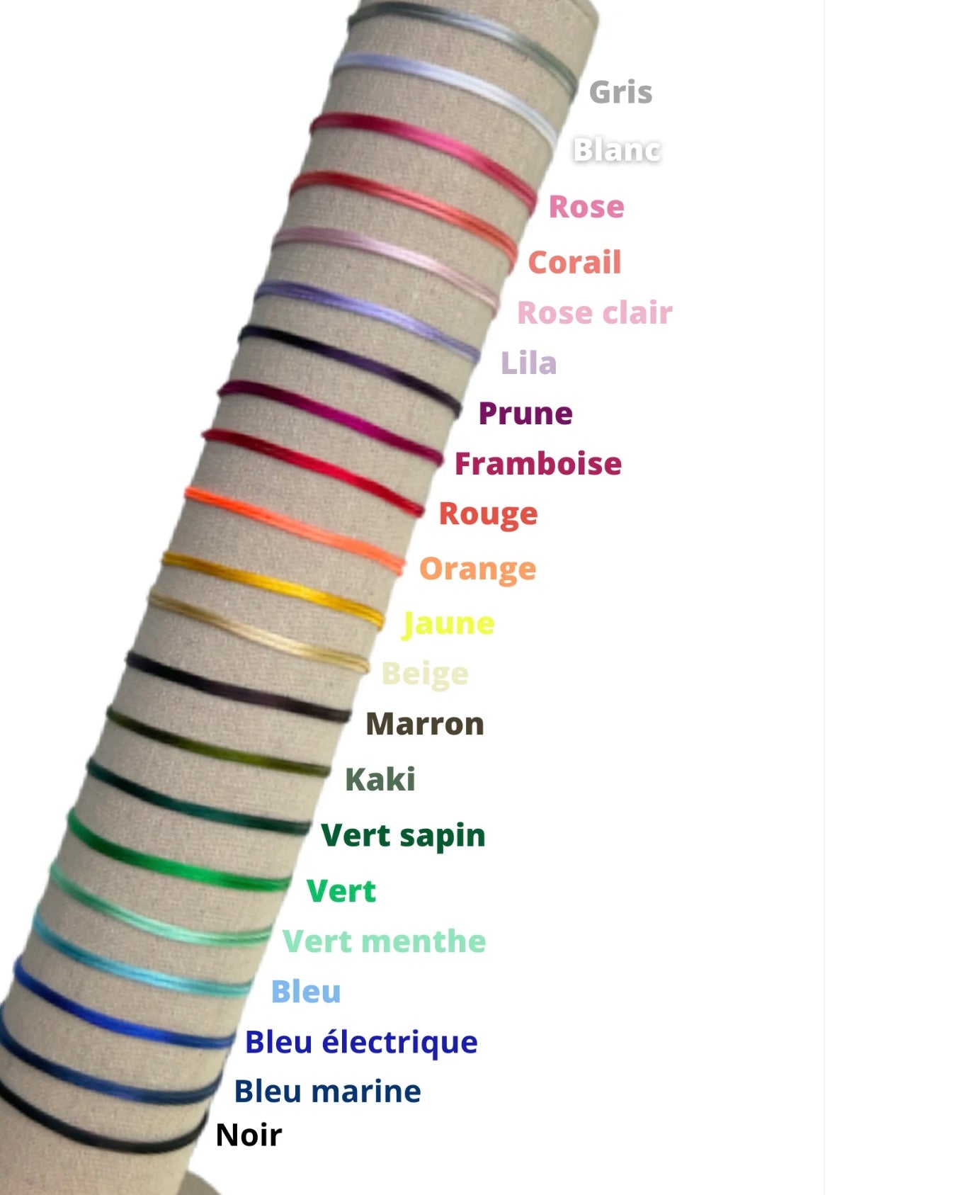 Le fil de soie possède une bonne résistance et se détendra très peu. Il permet de créer des bracelets durables et de très belle qualité. La soie est une matière douce et très agréable à porter.